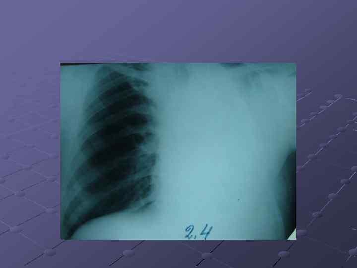 Тотальное однородное затемнение дают 2. Тотальный выпотной плеврит – скопление большого количества жидкости в плевральных полостях. Органы средостения смещены в здоровую сторону.