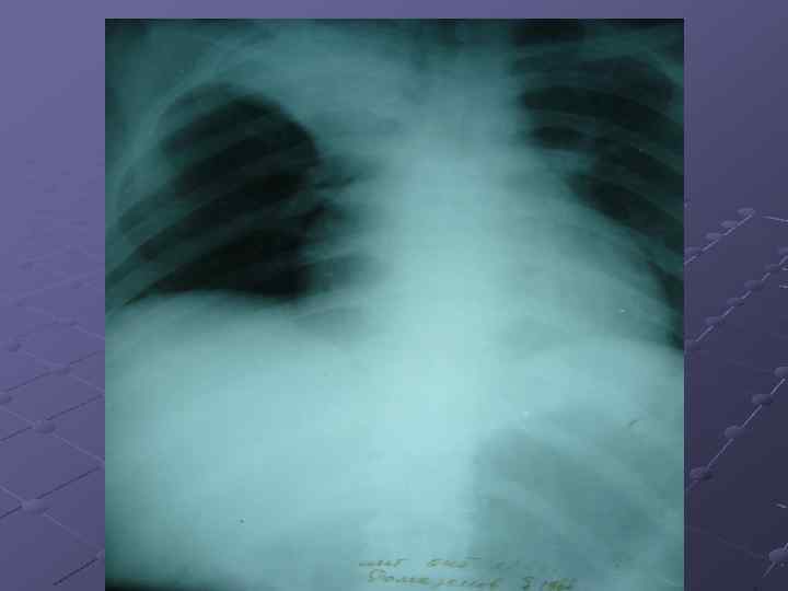 ПНЕВМОТОРАКС На рентгенограмме – левосторонний пневмоторакс. Видна тень коллабированного легкого. На фоне просветления отсутствует легочный рисунок.