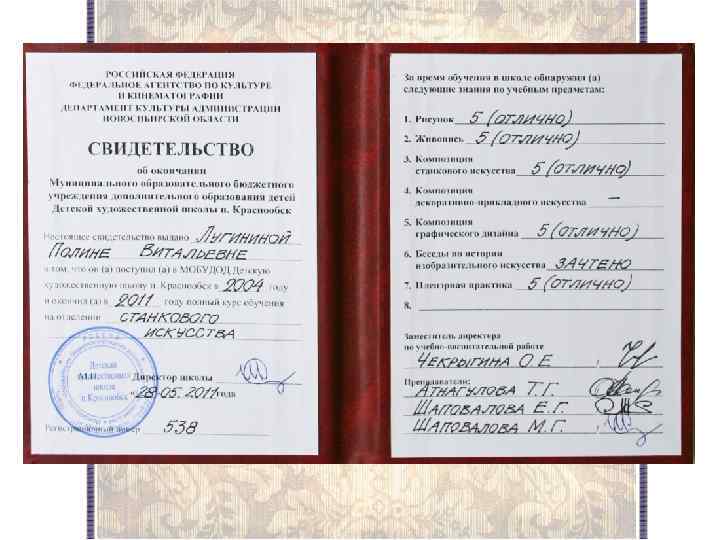 Лугинина Полина Витальевна родилась 20 20 октября 1996 года. В Муниципальном образовательном бюджетном учреждении дополнительного образования детей Детская художественная школа п. Краснообск (МОБУДОД ДХШ п. Краснообск) начала обучение на подготовительном отделении с сентября 2001 года , а затем продолжила обучение на отделениях станкового искусства. На протяжении всех лет обучения занималась у преподавателей: Огневой Татьяны Юрьевны (преподаватель I квалификационной категории. ), Поповой Юлии Борисовны, Атнагуловой Татьяны Геннадьевны (преподаватель высшей квалификационной категории). В программу обучения входили следующие дисциплины: рисунок, живопись, основы композиции, композиция станкового искусства, история искусств, пленэр. Полина отличается особым отношением к учебному процессу. Ей свойственны качества, такие как: стабильность, целеустремленность, Аккуратность. Она ответственно подходит к выполнению каждой творческой работы, с увлечением подбирает материал и находит наиболее интересные решения. Полина неоднократно принимала участие в творческих выставках разного уровня, имеет грамоты и дипломы. Знания, полученные при обучении в ДХШ несомненно помогут воплотить в жизнь самые смелые творческие идеи.