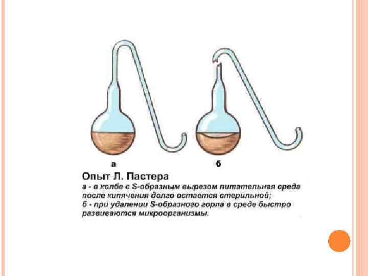 Изучение самозарождения микробов В 1860— 1862 годах Пастер изучал возможность самозарождения микроорганизмов. Он провёл элегантный опыт, доказавший невозможность самозарождения микробов (в современных условиях, хотя тогда не поднимался вопрос возможности самозарождения в прошлые эпохи), взяв термически стерилизованную питательную среду и поместив её в открытый сосуд с длинным изогнутым горлышком. Сколько бы сосуд ни стоял на воздухе, никаких признаков жизни в нём не наблюдалось, поскольку содержащиеся в воздухе споры бактерий оседали на изгибах горлышка. Но стоило отломить его или сполоснуть жидкой средой изгибы, как вскоре в среде начинали размножаться микроорганизмы, вышедшие из спор. В 1862 году Французская академия наук присудила Пастеру премию за разрешение вопроса о самозарождении жизни.