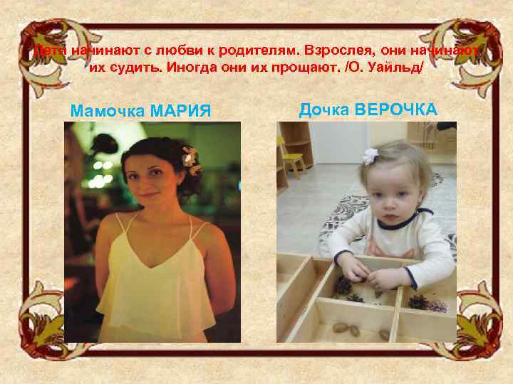 Дети начинают с любви к родителям. Взрослея, они начинают их судить. Иногда они их прощают. /О. Уайльд/ Мамочка МАРИЯ Дочка ВЕРОЧКА