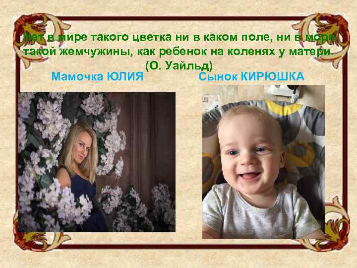 Нет в мире такого цветка ни в каком поле, ни в море такой жемчужины, как ребенок на коленях у матери. (О. Уайльд) Мамочка ЮЛИЯ Сынок КИРЮШКА