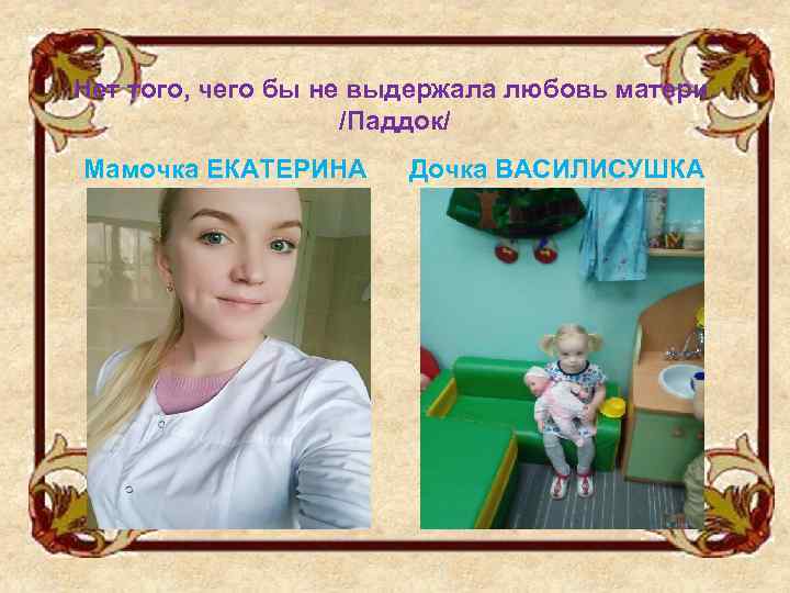 Нет того, чего бы не выдержала любовь матери. /Паддок/ Мамочка ЕКАТЕРИНА Дочка ВАСИЛИСУШКА