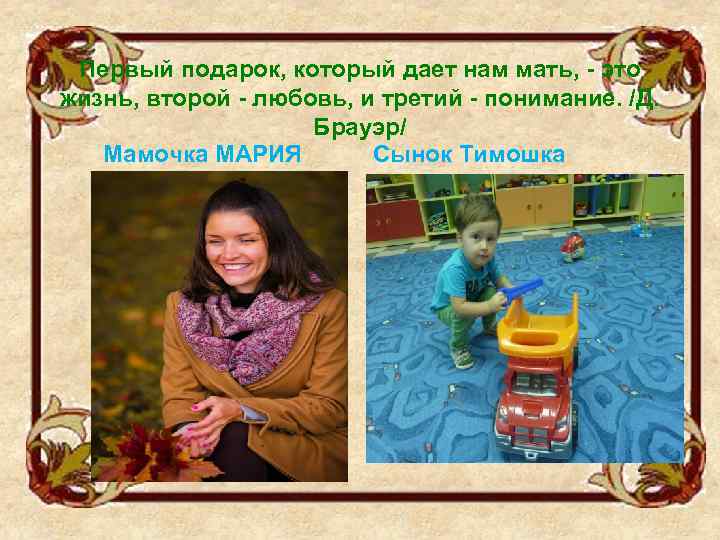 Первый подарок, который дает нам мать, - это жизнь, второй - любовь, и третий - понимание. /Д. Брауэр/ Мамочка МАРИЯ Сынок Тимошка