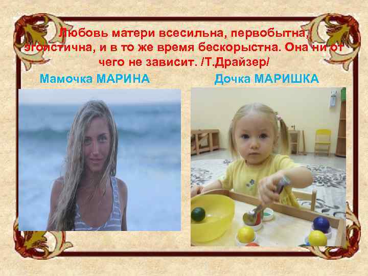 Любовь матери всесильна, первобытна, эгоистична, и в то же время бескорыстна. Она ни от чего не зависит. /Т. Драйзер/ Мамочка МАРИНА Дочка МАРИШКА