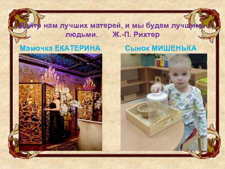 Дайте нам лучших матерей, и мы будем лучшими людьми. Ж. -П. Рихтер Мамочка ЕКАТЕРИНА Сынок МИШЕНЬКА
