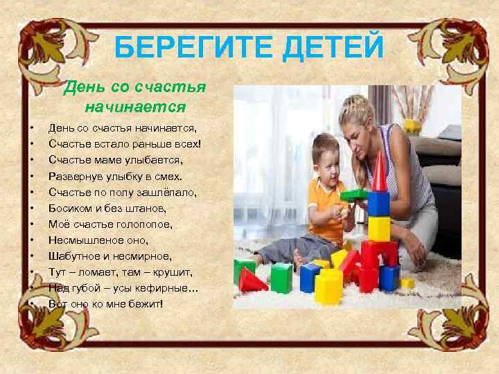 БЕРЕГИТЕ ДЕТЕЙ День со счастья начинается • • • День со счастья начинается, Счастье встало раньше всех! Счастье маме улыбается, Развернув улыбку в смех. Счастье по полу зашлёпало, Босиком и без штанов, Моё счастье голопопое, Несмышленое оно, Шабутное и несмирное, Тут – ломает, там – крушит, Над губой – усы кефирные… Вот оно ко мне бежит!