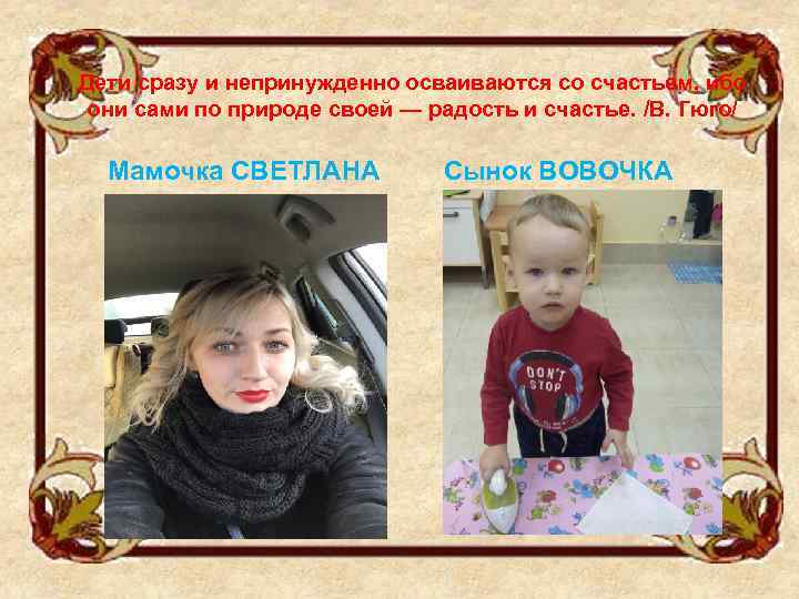 Дети сразу и непринужденно осваиваются со счастьем, ибо они сами по природе своей — радость и счастье. /В. Гюго/ Мамочка СВЕТЛАНА Сынок ВОВОЧКА