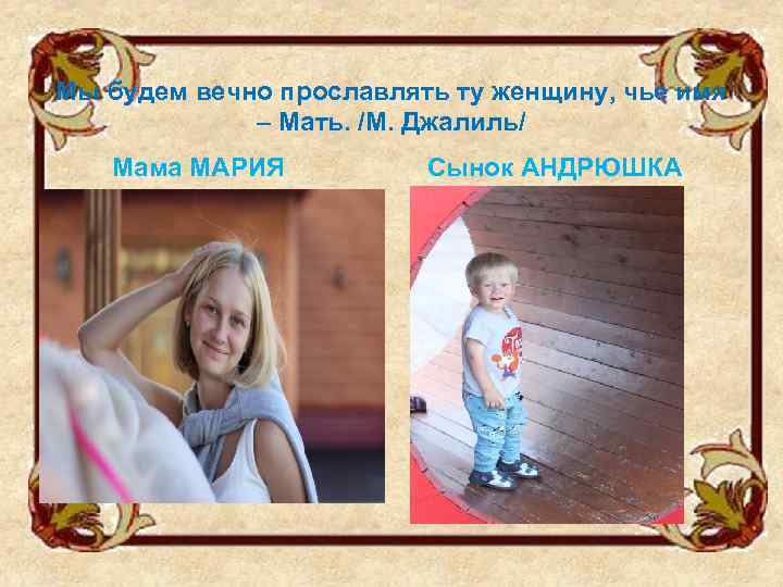 Мы будем вечно прославлять ту женщину, чье имя – Мать. /М. Джалиль/ Мама МАРИЯ Сынок АНДРЮШКА