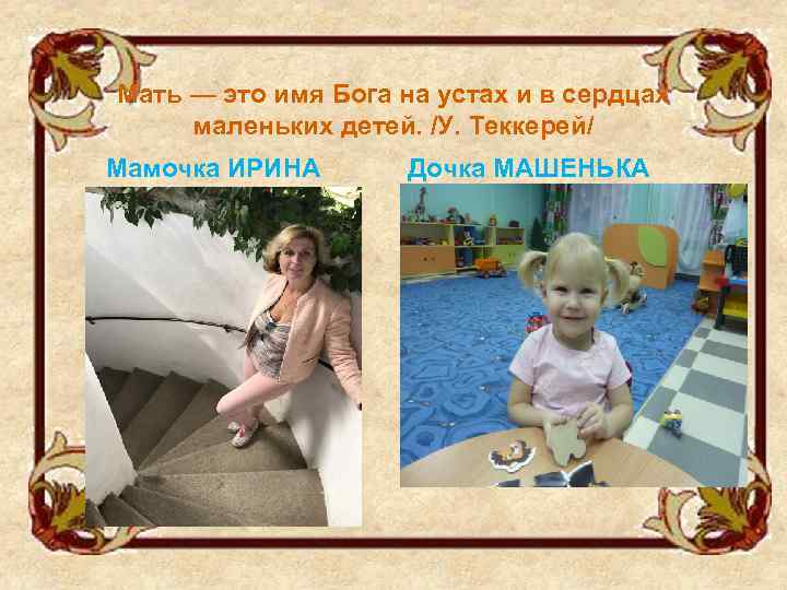 Мать — это имя Бога на устах и в сердцах маленьких детей. /У. Теккерей/ Мамочка ИРИНА Дочка МАШЕНЬКА
