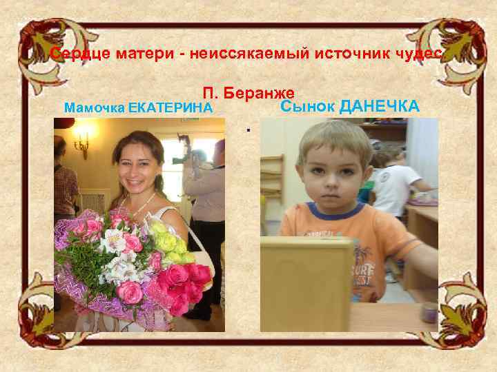 Сердце матери - неиссякаемый источник чудес. П. Беранже Сынок ДАНЕЧКА Мамочка ЕКАТЕРИНА .