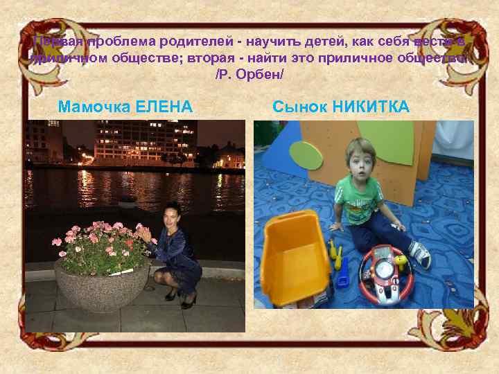Первая проблема родителей - научить детей, как себя вести в приличном обществе; вторая - найти это приличное общество. /Р. Орбен/ Мамочка ЕЛЕНА Сынок НИКИТКА