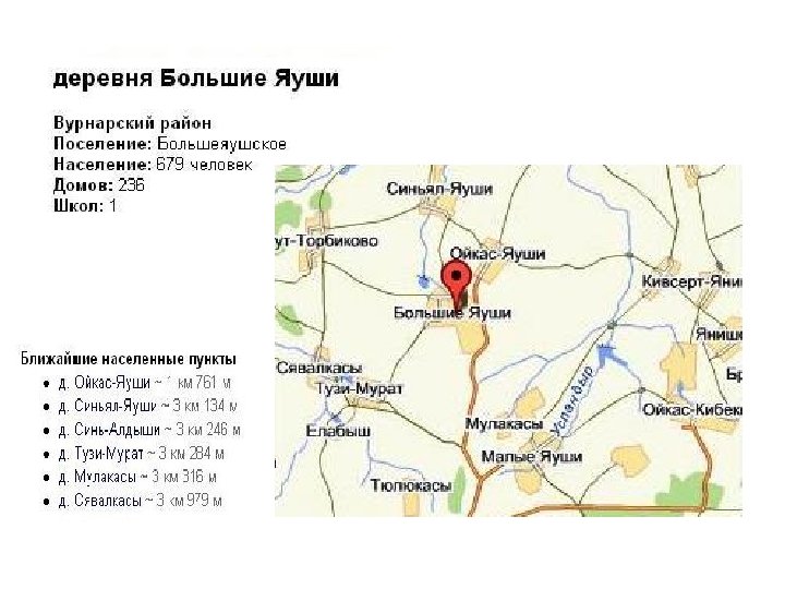 Административным центром Большеяушского сельского поселения является д. Большие Яуши Вурнарского района Чувашской Республики В состав территории Большеяушского сельского поселения входят: ü д. Большие Яуши ü д. Ойкас-Яуши ü д. Синьял-Яуши Всего на территории 495 дворов, 1144 человека. На территории поселения – ü ü ü ü ü средняя общеобразовательная школа, Большеяушское отделение врачебной (общей) практики, сельский Дом культуры, два клуба, две библиотеки, отделение связи, семь предприятий торговли , спортзал (в школе), спортплощадка (в СХП), два музея (истории и краеведения). Фотография Фомина А. В. – ул. Коммунальная д. б. Яуши