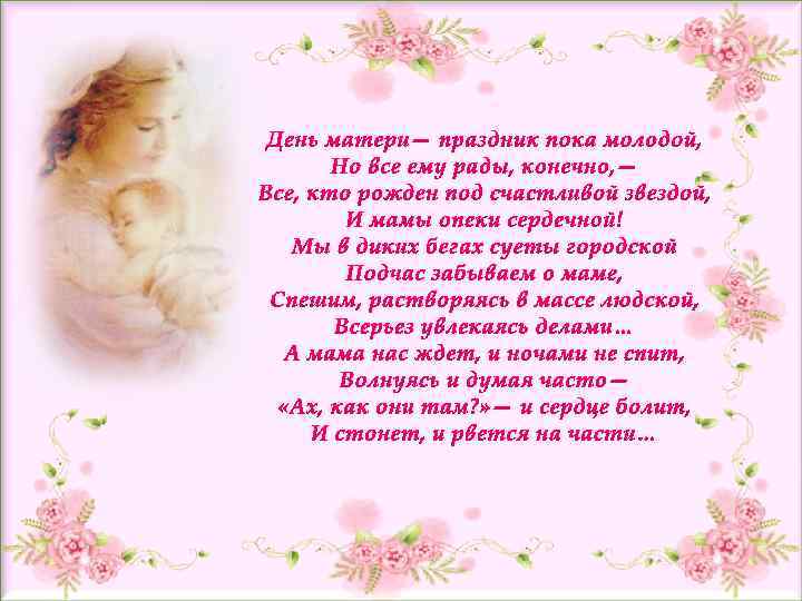 Любому, кто живет на белом свете, Любить, кто может, думать и дышать, На нашей грешной голубой планете Родней и ближе слова нет, чем мать. Нам наши мамы, мамочки родные Сердца и жизни отдадут без слов. Для нас они воистину святые, Неважно, что нет нимбов у голов. Мы маму вспоминаем, словно Бога, Коль с нами вдруг случается беда. Ухабиста, порой судьбы дорога, Однако матери поймут детей всегда. Поймут детей и в радости и в горе, Уберегут родных детей от бед. С родной лишь мамой по колено море, Лишь мамин нужен в трудный миг совет. Мы в жизни разными дорогами шагали Неважно, сколько зим и сколько лет, Но эту истину давно уже познали: Родней, чем мама, человека нет.