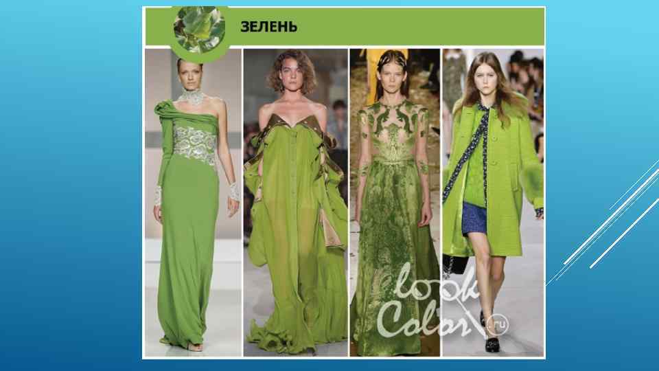 Цвет весенней зелени напоминает нам о цветущем луге и заставляет думать о здоровом образе жизни Желто-зеленый оттенок модно комбинировать с Синим Лазуритом (3) и Райским Островом (5). ЗЕЛЕНЬ
