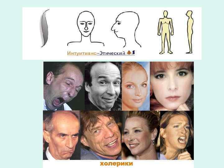 Холерик • • • • хрупкость внешнего облика, худоба и худощавость, телосложение сухое Вытянутые части тела. Сильное развитие конечностей, акцент фигуры на конечностях. Длинные тонкие мускулы и кости. Отсутствие выраженной склонности к ожирению, худоба. Высокая скорость обмена веществ. Грудная клетка узкая, длинная, плоская или вогнута, острый реберный угол. Слегка конусообразный череп, овальной или яйцеобразной слегка сужающийся кверху формы. Лоб плавно сужающийся кверху, конусообразный, без выступов и неровностей. Верхняя часть головы больше по объему. Подбородок заострен. Нижняя челюсть "слабая" или сильно скошенная, заметно сужается книзу. Скулы средне или сильно выражены, выступают, заострены. Нос ярко выраженной формы - с горбинкой "птичий", сильно выступающий, заостренный, удлиненный, вытянутый вперед, кончик явно опущен вниз по отношению к основанию. Затылок имеет выступы, сильно скашивается книзу, резкий переходи к шее. Заостренная теменная область. Шея длинная, средней толщины или тонкая, часто изогнута, на вид присутствует отделенность от головы и тела, кадык выражен. Ноги длинные, тонкие, колени худые, угловатые, острые, ступни узкие, вытянутые, узловатые, суставы резко выступают.