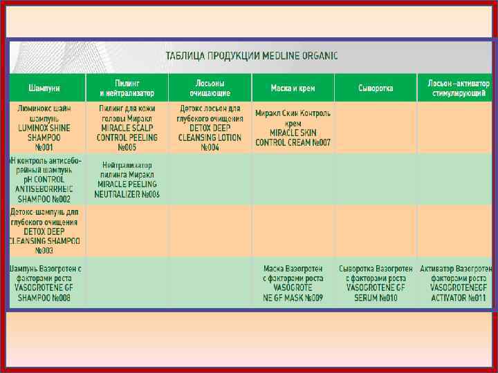 • • • Алгоритм для глубокого очищения кожи головы с применением средств линии Медлайн Органик Нанесите на кожу головы достаточное количество Пилинга для кожи головы Миракл (приблизительно 5 мл), затем распределите препарат массажными движениями. Избегайте попадания средства в глаза и на слизистые оболочки, губы, кожу век и ресницы. Оставляйте промежуток не менее 1, 5 см от зоны нанесения препарата до глаз. После нанесения оставьте пилинг на 5 -10 минут (в зависимости от чувствительности кожи). После окончания времени фиксации, нанесите Нейтрализатор Пилинга (Miracle Peeling Neutralizer) для прекращения действия пилинга (3 -5 мл). Используйте ватный тампон, смоченный нейтрализатором. После нанесения нейтрализатора, промойте голову обильным количеством воды. Выберите шампунь и вымойте голову. При выборе шампуня, учитывайте, что в p. H контроль антисеборейном шампуне присутствуют климбазол (противогрибковый компонент от перхоти)+ соединения серы (для подавления работы сальных желез); в Детокс-шампуне для глубокого очищения содержатся те же компоненты +салициловая кислота. Люминокс шайн шампунь не содержит лечебных компонентов “для кожи”, но направлен на улучшение структуры волос. После смывания шампуня рекомендуется нанести на волосы Восстанавливающую маску с кератином Диксидокс Де. Люкс № 4. 3 и смыть спустя 5 минут. Подсушить волосы феном. На кожу головы нанесите около 3 мл Детокс лосьона для глубокого очищения. Слегка вотрите препарат в кожу, делая мягкий массаж. На этом этапе можно использовать физиотерапевтическое воздействие, например, лазерное. Лосьон не смывать. Закончите процедуру нанесением на волосы Восстанавливающей сыворотки с кератином Диксидокс Де. Люкс № 4. 5 (количество зависит от длины волос).