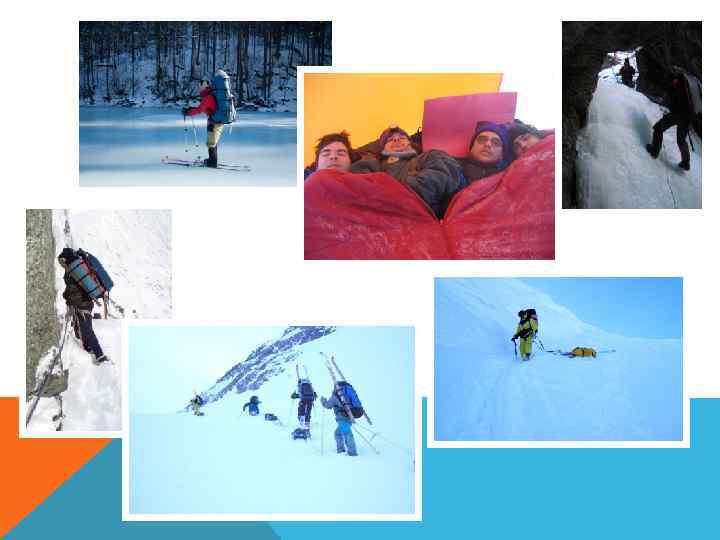 КАК ЖИТЬ ЗИМОЙ ЧТОБЫ НЕ ПОГИБНУТЬ? ) • Можно сидеть дома ; -) • Встал на привал – одень пуховку! • Постоянно двигаемся – дел на биваке всегда полно, а пока двигаешься шансов замерзнуть меньше; • Лавины – надо всегда о них помнить; • Пурга, метель – иногда приходится сидеть по несколько суток(!); • Работаем всегда в перчатках – тонкий флис/шерсть это вторая кожа! • Крема, батарейки, техника замерзает – всегда храним на себе! • Руки греем в промежности, ноги на животе у соседа; • Если надо отогреть человека – то раздеваемся и ложимся один в спальник • Сушим вещи на себе ночью или на морозе/ветру/солнце днем • НЕ умываемся! • Все, что упало, то пропало! • Все, что может сломаться – сломается! • Не стоит посреди похода часто жить в тепле – разаклиматизация.