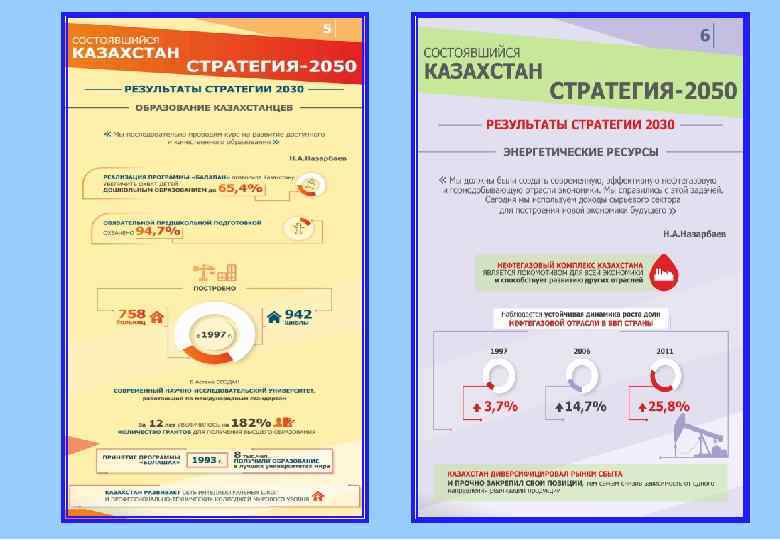 Сегодня каждый из нас может сказать: «Стратегия-2030 сработала, современный Казахстан состоялся. Это результат нашего единения, упорного, кропотливого труда, живое воплощение наших устремлений и надежд» . Н. А. Назарбаев
