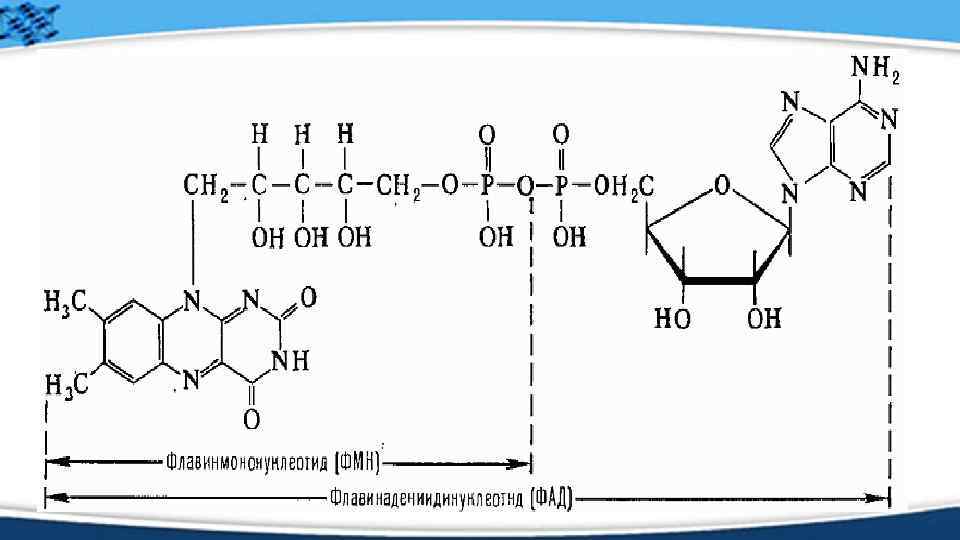 Коферменттер ФАД және ФМН ФAД және ФMН флавиндік коферменттер. ФAДфлавинаденинди-нуклеотид, ФMН-флавинмононуклеотид. ФAД және ФMН коферменттері әр түрлі апоферменттермен байланысады да, флавопротеинді ферменттер- флавиндік дегидрогеназа түзеді. Қазіргі кезде флавопротеиндердің саны 80 шамасына жетеді және олардың көпшілігінде ФAД бар. ФAД және ФMН екеуі апоферменттермен мықты байланысқан және НАД⁺және НАДФ⁺ екеуінен айырмасы, катализдік реакция кезінде ферменттің белоктық бөлігіне байланысқан күйінде қалады. Сондықтан оларды простетикалық топтар деп атайды.