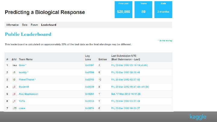 Kaggle’s Dark Matter Competition on the White House blog “The world’s brightest physicists have been working for decades on solving one of the great unifying problems of our universe” “In less than a week, Martin O’Leary, a Ph. D student in glaciology, outperformed the state-of-the-art algorithms”
