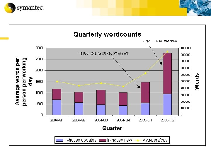 Solutions (1) § Two-tier process Ø Leverage Trados TM repository Ø Use MT system to translate unknown segments (Systran Premium 5. 0) Ø Use MT output as TM input § Determine the export threshold Ø Existing TM segments vs. new controlled segments – Uncontrolled: Symantec announced a patch was available – CL: Symantec announced that a patch was available