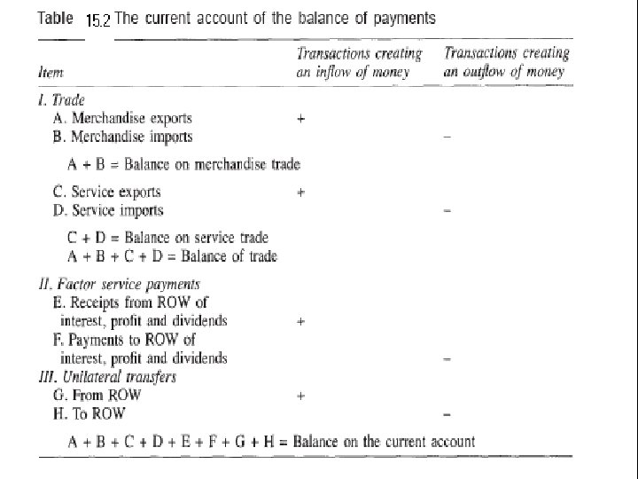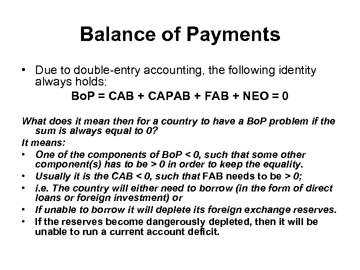 Balance of Payments • Due to double-entry accounting, the following identity always holds: Bo. P = CAB + CAPAB + FAB + NEO = 0 What does it mean then for a country to have a Bo. P problem if the sum is always equal to 0? It means: • One of the components of Bo. P < 0, such that some other component(s) has to be > 0 in order to keep the equality. • Usually it is the CAB < 0, such that FAB needs to be > 0; • i. e. The country will either need to borrow (in the form of direct loans or foreign investment) or • If unable to borrow it will deplete its foreign exchange reserves. • If the reserves become dangerously depleted, then it will be unable to run a current account deficit.