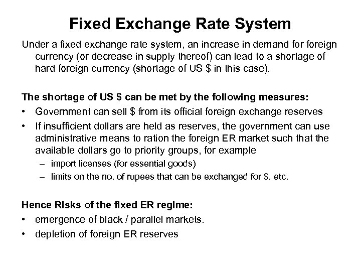 Fixed Exchange Rate System Under a fixed exchange rate system, an increase in demand foreign currency (or decrease in supply thereof) can lead to a shortage of hard foreign currency (shortage of US $ in this case). The shortage of US $ can be met by the following measures: • Government can sell $ from its official foreign exchange reserves • If insufficient dollars are held as reserves, the government can use administrative means to ration the foreign ER market such that the available dollars go to priority groups, for example – import licenses (for essential goods) – limits on the no. of rupees that can be exchanged for $, etc. Hence Risks of the fixed ER regime: • emergence of black / parallel markets. • depletion of foreign ER reserves