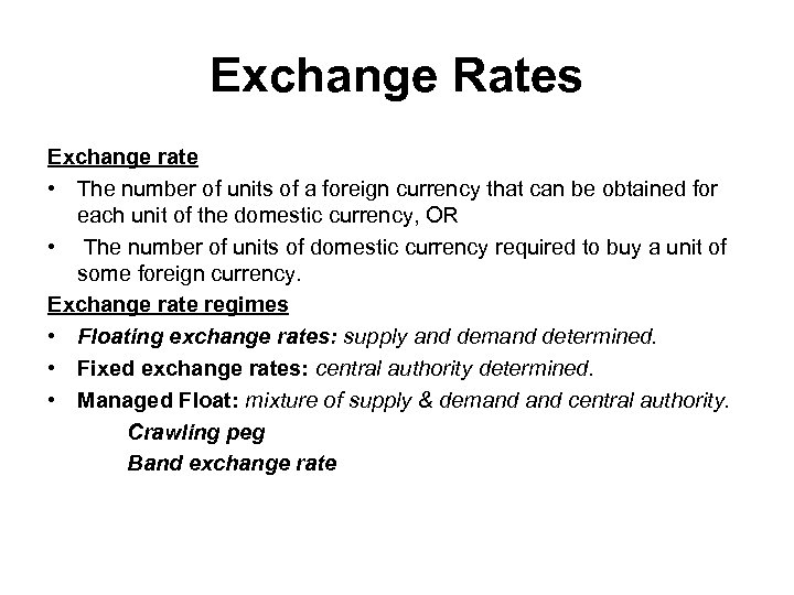 Exchange Rates Exchange rate • The number of units of a foreign currency that can be obtained for each unit of the domestic currency, OR • The number of units of domestic currency required to buy a unit of some foreign currency. Exchange rate regimes • Floating exchange rates: supply and demand determined. • Fixed exchange rates: central authority determined. • Managed Float: mixture of supply & demand central authority. Crawling peg Band exchange rate