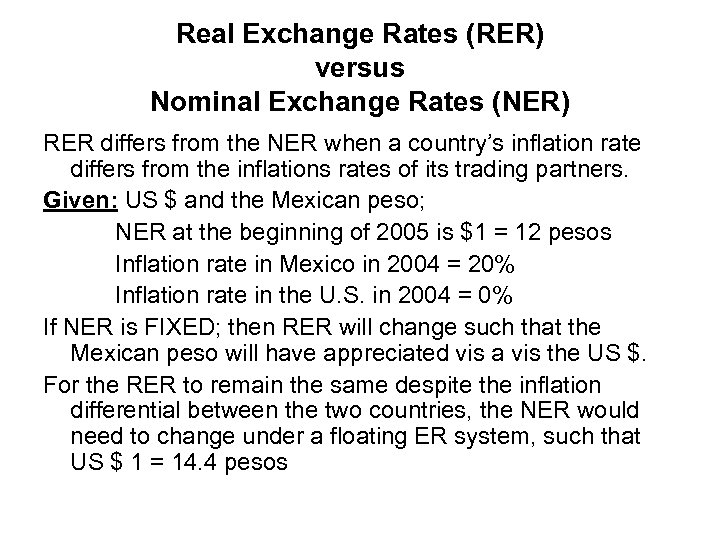 Real Exchange Rates (RER) versus Nominal Exchange Rates (NER) RER differs from the NER when a country’s inflation rate differs from the inflations rates of its trading partners. Given: US $ and the Mexican peso; NER at the beginning of 2005 is $1 = 12 pesos Inflation rate in Mexico in 2004 = 20% Inflation rate in the U. S. in 2004 = 0% If NER is FIXED; then RER will change such that the Mexican peso will have appreciated vis a vis the US $. For the RER to remain the same despite the inflation differential between the two countries, the NER would need to change under a floating ER system, such that US $ 1 = 14. 4 pesos