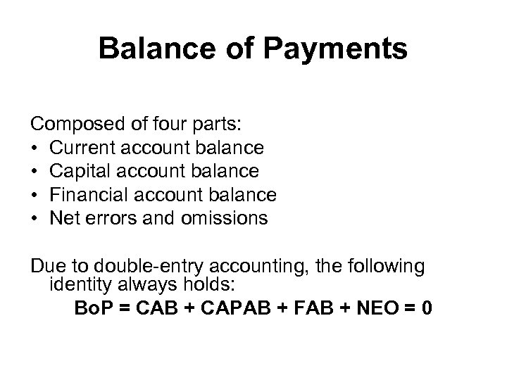 Balance of Payments Composed of four parts: • Current account balance • Capital account balance • Financial account balance • Net errors and omissions Due to double-entry accounting, the following identity always holds: Bo. P = CAB + CAPAB + FAB + NEO = 0