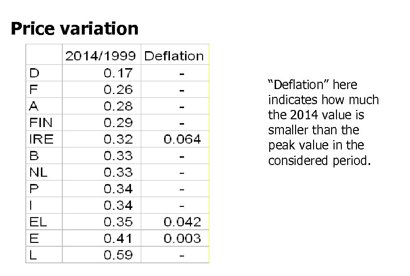 Price variation “Deflation” here indicates how much the 2014 value is smaller than the peak value in the considered period.