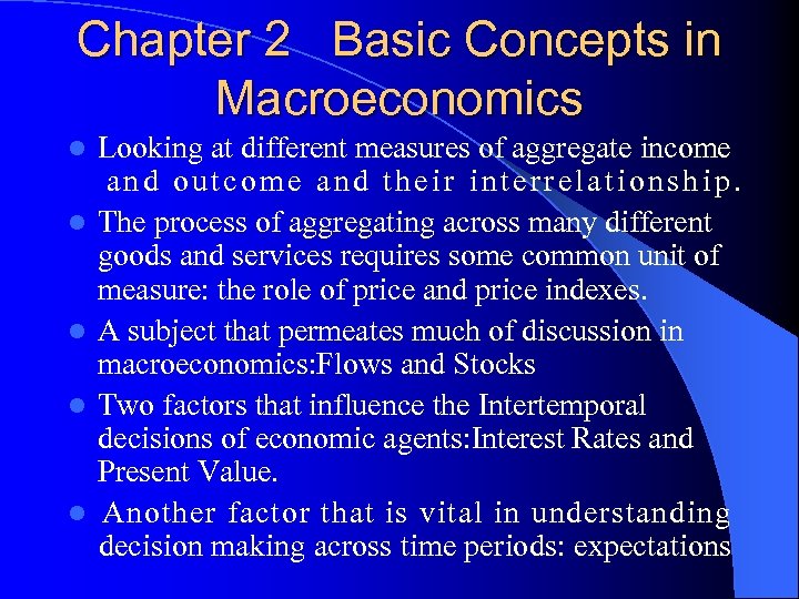 Chapter 2 Basic Concepts in Macroeconomics l l l Looking at different measures of aggregate income and outcome and their interrelationship. The process of aggregating across many different goods and services requires some common unit of measure: the role of price and price indexes. A subject that permeates much of discussion in macroeconomics: Flows and Stocks Two factors that influence the Intertemporal decisions of economic agents: Interest Rates and Present Value. Another factor that is vital in understanding decision making across time periods: expectations