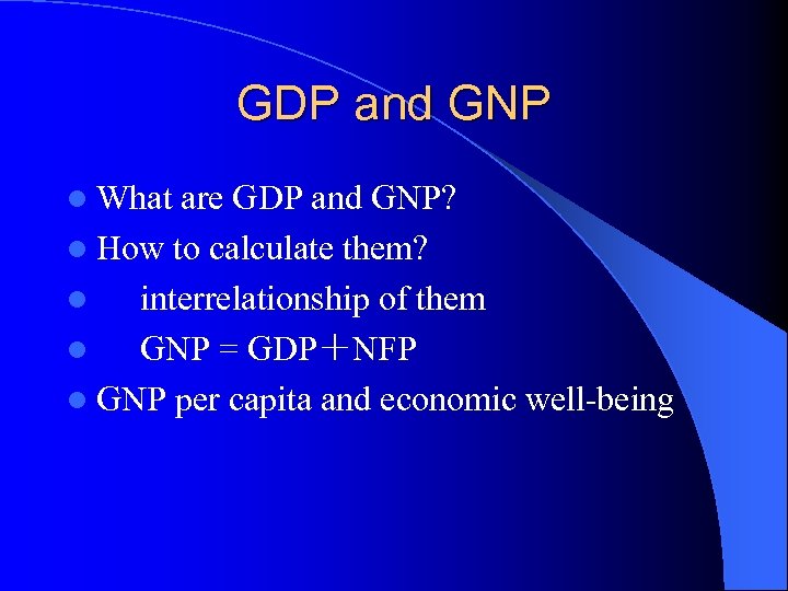 GDP and GNP l What are GDP and GNP? l How to calculate them? l interrelationship of them l GNP = GDP+NFP l GNP per capita and economic well-being