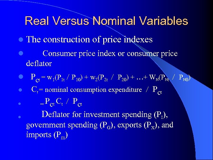 Real Versus Nominal Variables l The l construction of price indexes Consumer price index or consumer price deflator l Pct = w 1(P 1 t/P 10) + w 2(P 2 t / P 20) + …+ WN(PNt / PN 0) l l l Ct = nominal consumption expenditure / Pct = Pc t C t / Pc t Deflator for investment spending (PI), government spending (PG), exports (PX), and imports (Pm)