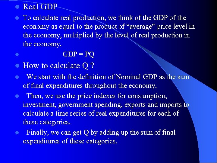 l Real GDP To calculate real production, we think of the GDP of the economy as equal to the product of “average” price level in the economy, multiplied by the level of real production in the economy. l GDP = PQ l l How to calculate Q ? We start with the definition of Nominal GDP as the sum of final expenditures throughout the economy. l Then, we use the price indexes for consumption, investment, government spending, exports and imports to calculate a time series of real expenditures for each of these categories. l Finally, we can get Q by adding up the sum of final expenditures of these categories. l