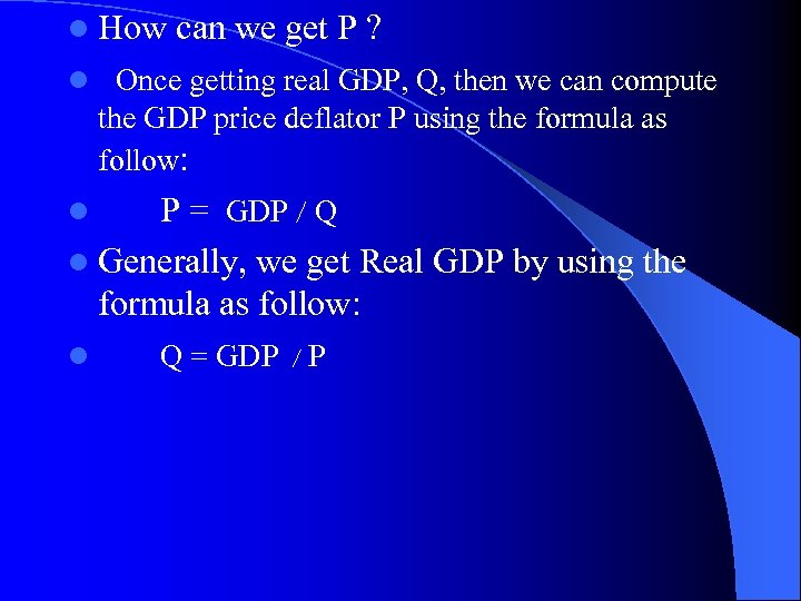 l How can we get P ? l Once getting real GDP, Q, then we can compute the GDP price deflator P using the formula as follow: P = GDP/Q l Generally, we get Real GDP by using the formula as follow: l l Q = GDP /P