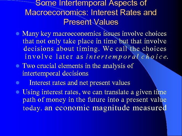 Some Intertemporal Aspects of Macroeconomics: Interest Rates and Present Values Many key macroeconomics issues involve choices that not only take place in time but that involve decisions about timing. We call the choices i n v o l v e l a t e r a s i n t e r t e m p o r a l c h o i c e. l Two crucial elements in the analysis of intertemporal decisions l Interest rates and net present values l Using interest rates, we can translate a given time path of money in the future into a present value today. an economic magnitude measured l
