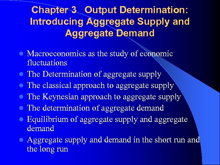 Chapter 3 Output Determination: Introducing Aggregate Supply and Aggregate Demand l l l l Macroeconomics as the study of economic fluctuations The Determination of aggregate supply The classical approach to aggregate supply The Keynesian approach to aggregate supply The determination of aggregate demand Equilibrium of aggregate supply and aggregate demand Aggregate supply and demand in the short run and the long run