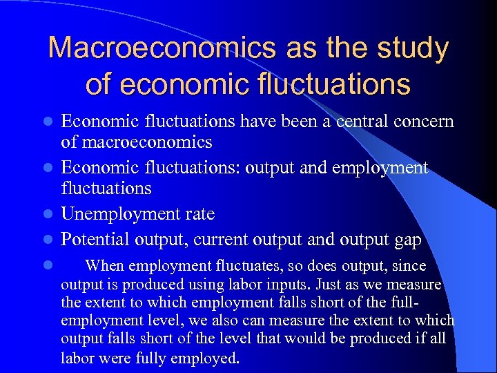 Macroeconomics as the study of economic fluctuations Economic fluctuations have been a central concern of macroeconomics l Economic fluctuations: output and employment fluctuations l Unemployment rate l Potential output, current output and output gap l l When employment fluctuates, so does output, since output is produced using labor inputs. Just as we measure the extent to which employment falls short of the fullemployment level, we also can measure the extent to which output falls short of the level that would be produced if all labor were fully employed.