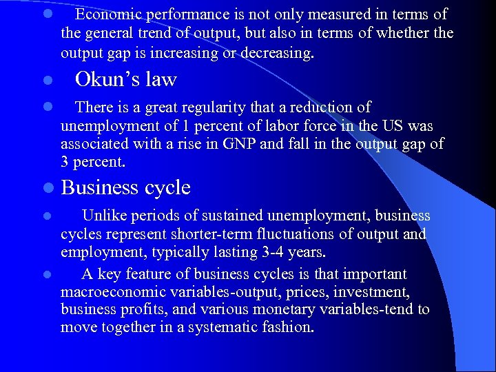 l l l Economic performance is not only measured in terms of the general trend of output, but also in terms of whether the output gap is increasing or decreasing. Okun’s law There is a great regularity that a reduction of unemployment of 1 percent of labor force in the US was associated with a rise in GNP and fall in the output gap of 3 percent. l Business cycle Unlike periods of sustained unemployment, business cycles represent shorter-term fluctuations of output and employment, typically lasting 3 -4 years. l A key feature of business cycles is that important macroeconomic variables-output, prices, investment, business profits, and various monetary variables-tend to move together in a systematic fashion. l