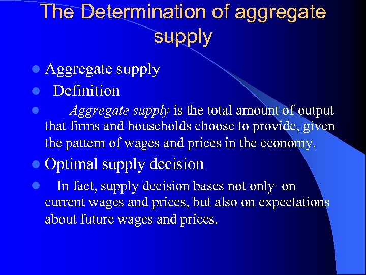 The Determination of aggregate supply l Aggregate supply l Definition l Aggregate supply is the total amount of output that firms and households choose to provide, given the pattern of wages and prices in the economy. l Optimal l supply decision In fact, supply decision bases not only on current wages and prices, but also on expectations about future wages and prices.