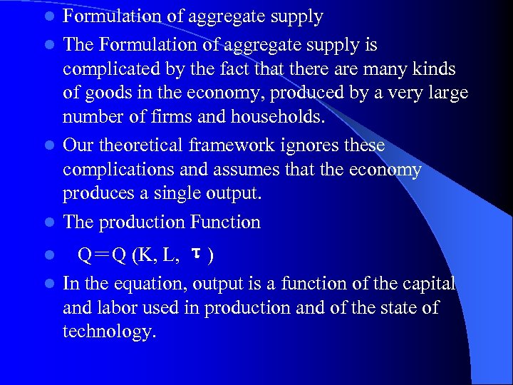 Formulation of aggregate supply l The Formulation of aggregate supply is complicated by the fact that there are many kinds of goods in the economy, produced by a very large number of firms and households. l Our theoretical framework ignores these complications and assumes that the economy produces a single output. l The production Function l Q=Q (K, L, τ) l In the equation, output is a function of the capital and labor used in production and of the state of technology. l