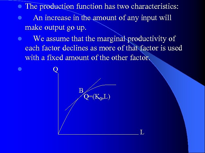 The production function has two characteristics: l An increase in the amount of any input will make output go up. l We assume that the marginal productivity of each factor declines as more of that factor is used with a fixed amount of the other factor. l l Q B Q=(K 0, L) L