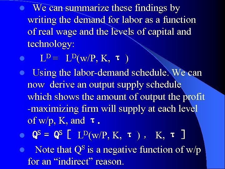 We can summarize these findings by writing the demand for labor as a function of real wage and the levels of capital and technology: l LD = LD(w/P, K, τ ) l Using the labor-demand schedule. We can now derive an output supply schedule which shows the amount of output the profit -maximizing firm will supply at each level of w/p, K, and τ. l QS = QS[ LD(w/P, K, τ ) , K, τ ] l Note that QS is a negative function of w/p for an “indirect” reason. l