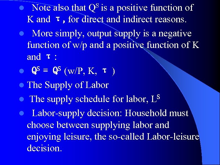 Note also that QS is a positive function of K and τ, for direct and indirect reasons. l More simply, output supply is a negative function of w/p and a positive function of K and τ: l QS = QS (w/P, K, τ ) l The Supply of Labor l The supply schedule for labor, LS l Labor-supply decision: Household must choose between supplying labor and enjoying leisure, the so-called Labor-leisure decision. l