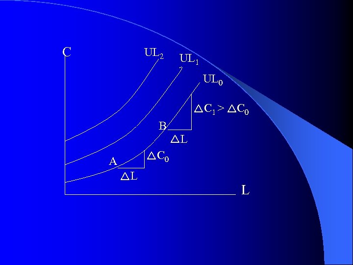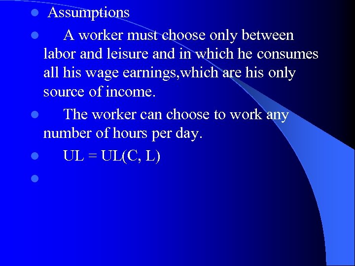 Assumptions l A worker must choose only between labor and leisure and in which he consumes all his wage earnings, which are his only source of income. l The worker can choose to work any number of hours per day. l UL = UL(C, L) l l