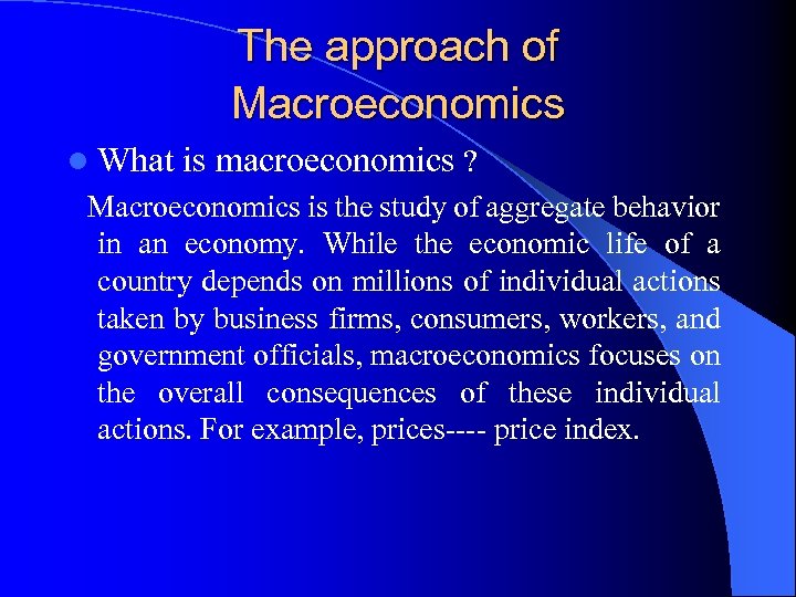 The approach of Macroeconomics l What is macroeconomics ? Macroeconomics is the study of aggregate behavior in an economy. While the economic life of a country depends on millions of individual actions taken by business firms, consumers, workers, and government officials, macroeconomics focuses on the overall consequences of these individual actions. For example, prices---- price index.