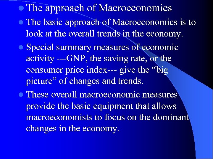 l The approach of Macroeconomics basic approach of Macroeconomics is to look at the overall trends in the economy. l Special summary measures of economic activity ---GNP, the saving rate, or the consumer price index--- give the “big picture” of changes and trends. l These overall macroeconomic measures provide the basic equipment that allows macroeconomists to focus on the dominant changes in the economy.