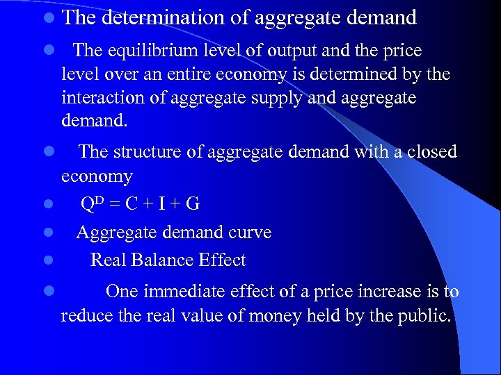 l The determination of aggregate demand l The equilibrium level of output and the price level over an entire economy is determined by the interaction of aggregate supply and aggregate demand. The structure of aggregate demand with a closed economy l QD = C + I + G l Aggregate demand curve l Real Balance Effect l l One immediate effect of a price increase is to reduce the real value of money held by the public.